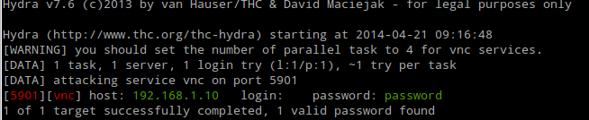 hydra -p "password" 192.168.1.10 vnc